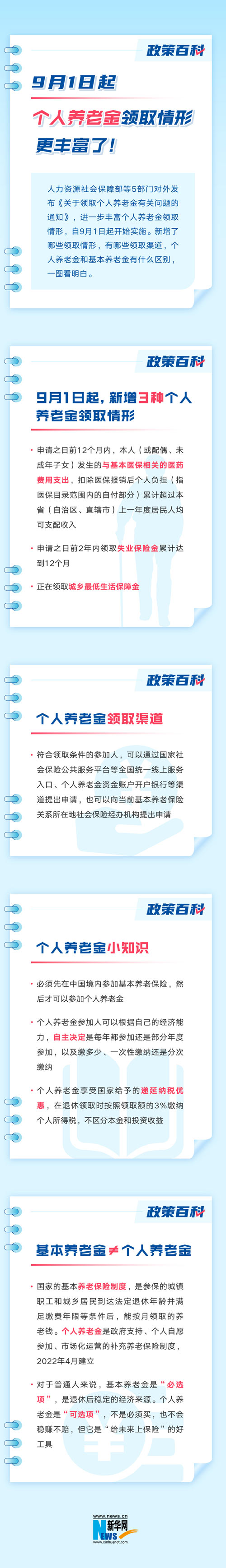 近日,人力资源社会保障部等5部门对外发布《关于领取个人养老金有关问题的通知》,进一步丰富个人养老金领取情形,自9月1日起开始实施。