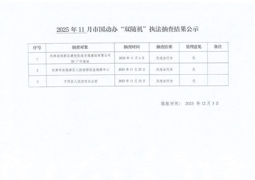 2025年11月天津市国动办“双随机”执法抽查结果公示