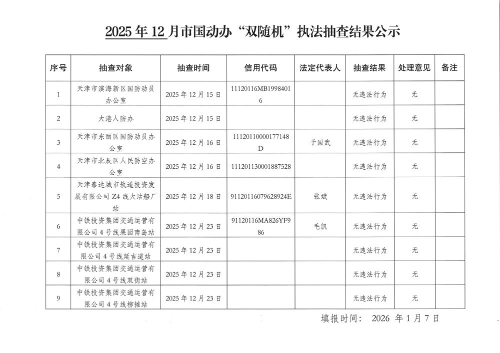 2025年12月天津市国动办“双随机”执法抽查结果公示